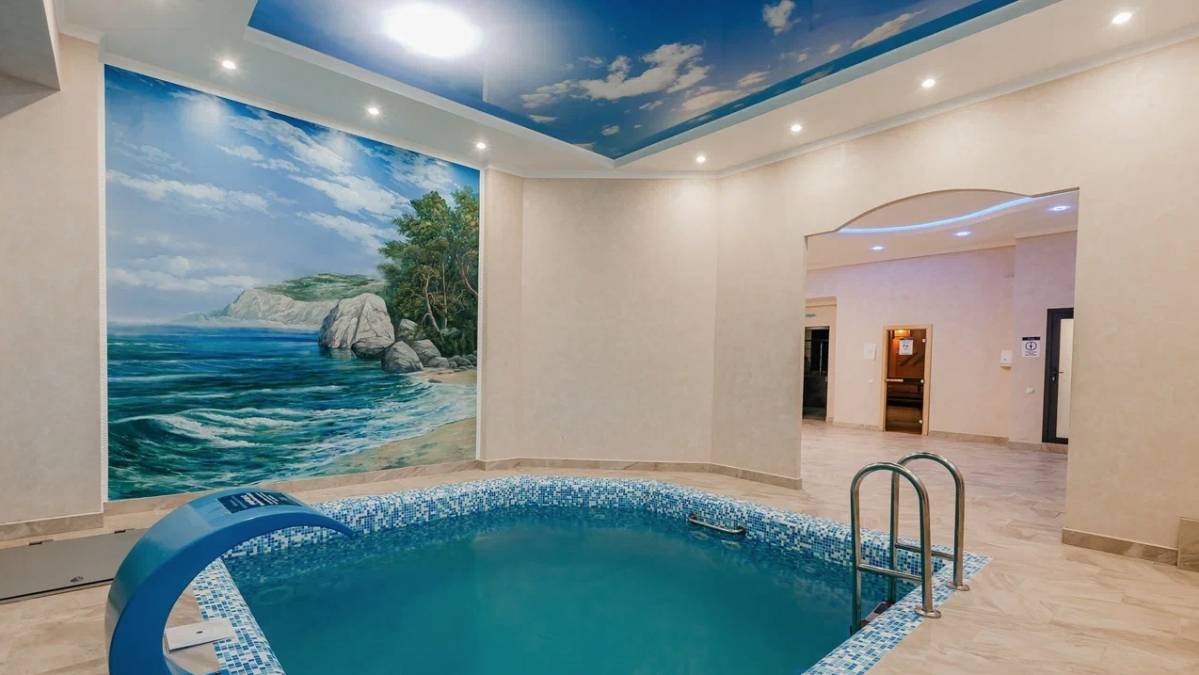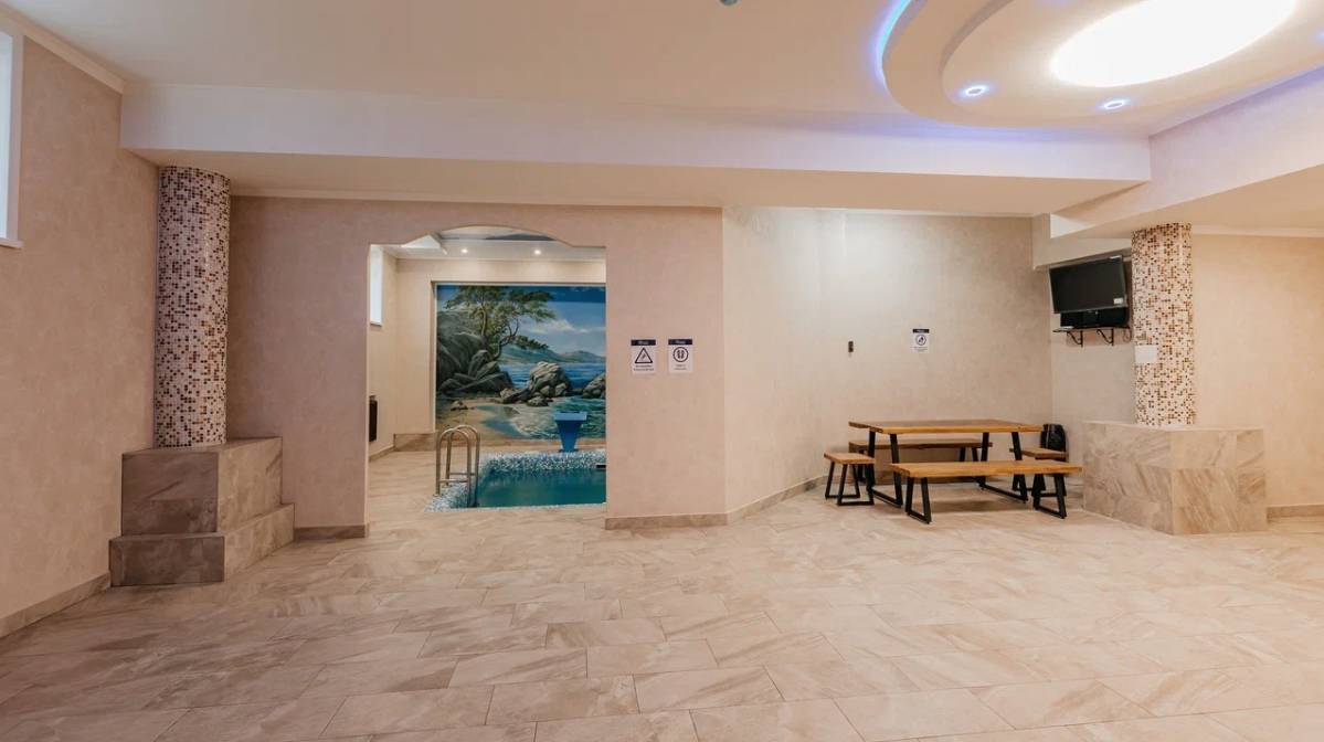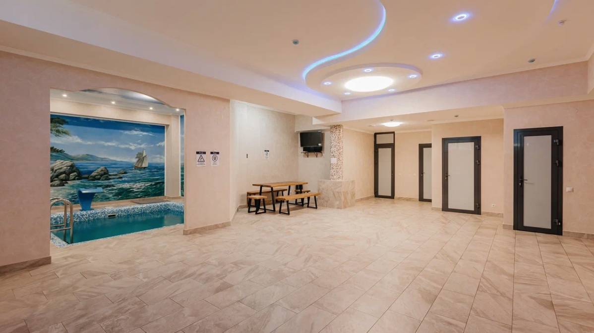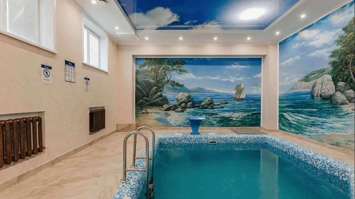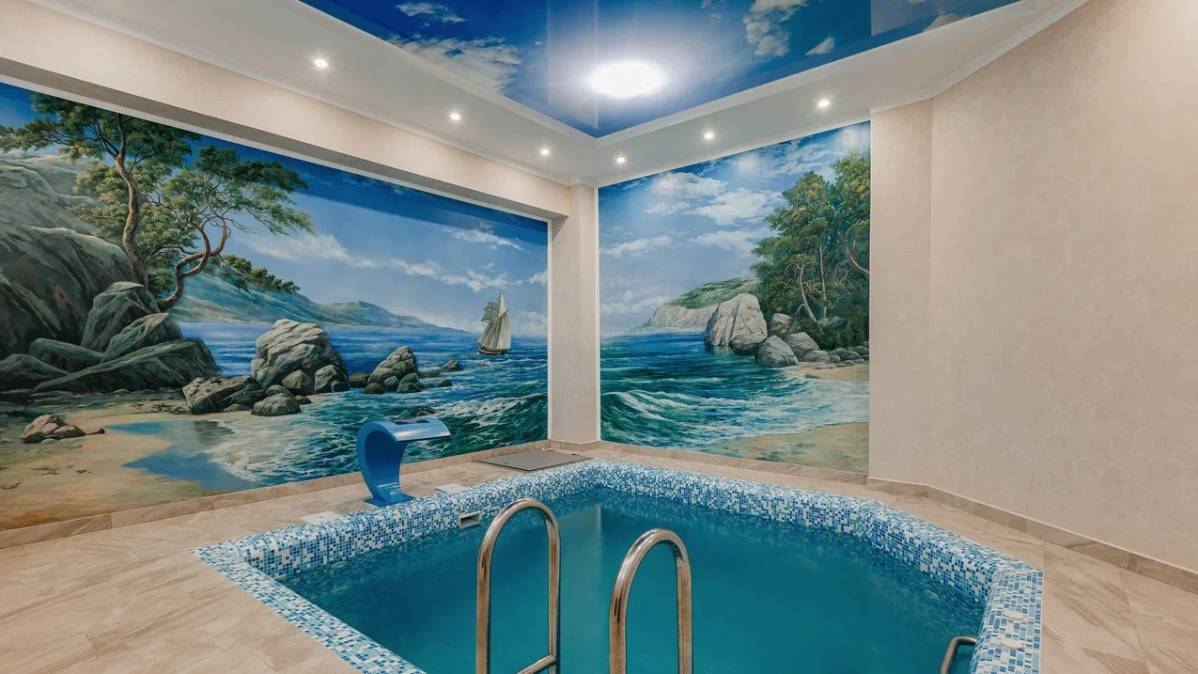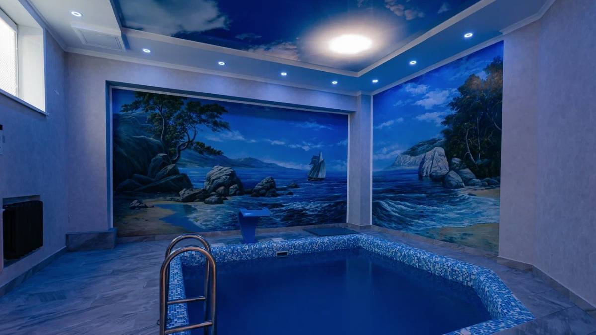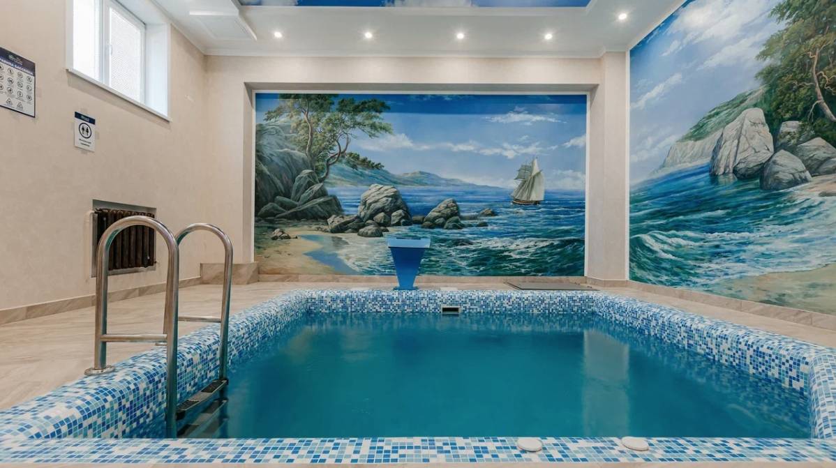 Бассейн, Размеры (Ш x Д x Г), м: 4.5 x 5.5 x 1.6, Теплый бассейн, Гидромассаж, Горки, Гейзер, Водопад, Подсветка, Детские горки,